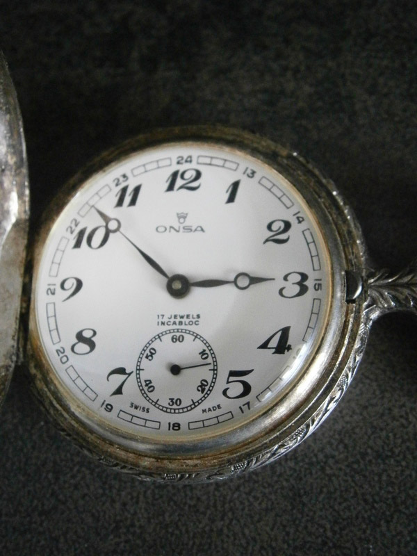 Ich habe heute Morgen auf einem Flohmarkt eine silberfarbige Taschenuhr Marke ONSA (sie ist vollkommen intakt) gefunden und da mein Vater Jäger ist und diese Uhr auf dem vorderen Deckel (dieser öffnet bei Druck auf die Krone) ein Jagdmotiv hat, habe ich sie für 10 Euro mitgenommen - wird mal ein Geschenk werden.
