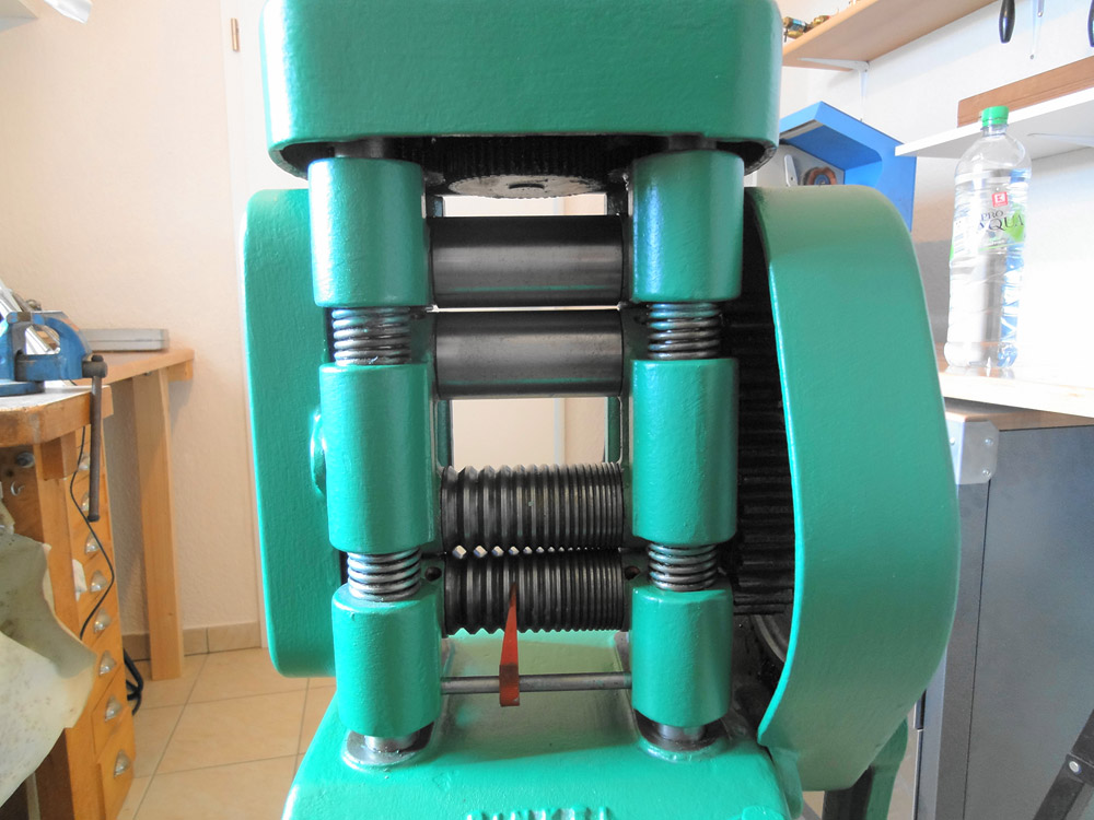 Die klassische Walzmaschine für den Goldschmied auf Rohrständer.