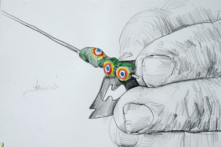 Die Herstellung einer authentischen KB im s.g. "triangular shape" (die gibt es immer nur in duo-chrome Blau (mit weissen Punkten/Augen) in monochrome Rot und dann in polychrome. Diese drei in gleicher Form und Größe werden grundsätzlich als Set getragen. Sie werden in die Haare geflochten und auf Höhe der linken Schläfe getragen (Fotos später). Die fast uni-blauen und einfarbigen Roten sind relativ schnell hergestellt, bzw. schnell(er) mit ihrem ein- und zweifarbigen "Design" überzogen. Diese Herstellung dauert in etwa 3-4 Stunden/Perle. Mittig, also zwischen diesen beiden (der blauen und der roten) wird die Polychrome getragen. Das ist die aufwendigste und heute auch am höchten bezahlte aller KB. Top-Exemplare kosten je nach Zustand zwischen 100 und 300/400 Euro, was maßgeblich vom Aufwand für das DEsign abhängt! Solche Perlen sind sehr-sehr zeitaufwendig herzustellen und brauchen teilweise bis zu einer Woche Arbeitszeit für ein EINZIGES STÜCK. Die Designs sind jedoch sehr unterschiedlich. Alle sind aufwendig - manche halt viel mehr als andere. Weniger als 2 Tage Arbeitszeit ist auch für weniger aufwändige Stücke unbekannt. Die Rede ist hier immer von den alten Perlen - NICHT den ab ca. 1990 hergestellten neuen Beads!