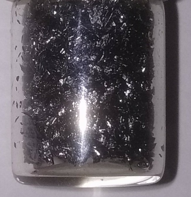 Das Harz verhindert nicht das Verflüchtigen, Iod gast in das Harz rein, was recht schnell ein schwärzliches Etwas aus der Probe macht. Im Glasgefängnis kommt es sehr schnell zu einem Gleichgewicht zwischen festem und gasförmigen Iod, und das unsichtbar, sehen tut nan nur das feste "Schwermetall". Festes Iod wird trotz seines Aussehens und Gewichtes (Dichte liegt bei knapp 5 g/ccm!) zu den Nichtmetallen (Halogenen) gezählt, obwohl es ein Halbleiter ist, dafür also genug freie entlang eines graphitähnlichen Schichtgitters vagabundierende Elektronen hat. Deshalb auch der deutliche Metallglanz. So eingesperrt ist es quasi auch dauerhaft und stabil.