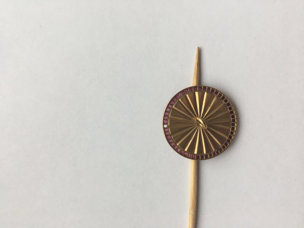 ich habe hier einen Knopf in Rotgold (Legierung unbekannt, nicht punziert, bisher nicht getestet), der in der Mitte eine Dentritenachat-Scheibe hat, welche rundherum von einem Ring mit kleinen Rubinen (in etwa quadratisch, etwas mehr als 1mm Kantenlänge, "Phantasie"-Schliff, als Laie/Nicht-Schleifer würde ich ihn am ehesten als Mischung aus Scherenschliff und Rosenschliff bezeichnen) besetzt ist. Die Rubine sind in einer Kanalfassung, wobei jeder Rubin an der Unterseite des Knopfes ein eigenes "Fach" hat.