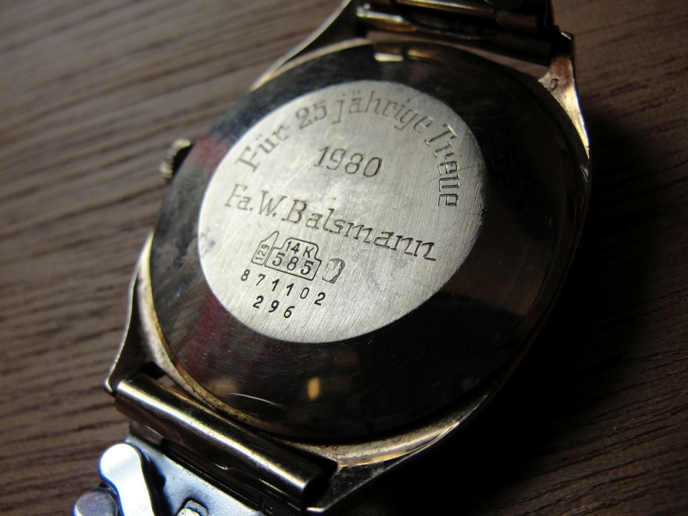 meine Freundin hat eine Uhr geerbt und sich mit der Frage, was sie damit machen soll, an mich gewendet. Sie will die Uhr nicht tragen, die Uhr steht natürlich und lässt sich auch nicht mehr stellen, wenn man die Krone herauszieht. Es handelt sich um eine Dugena Herrenuhr gestempelt mit Seriennummer 871102 296, 14 Karat, 585 und Eichhörnchen. Das Armband ist meiner Meinung nach nicht original, der Stempel verheisst Walzgold.