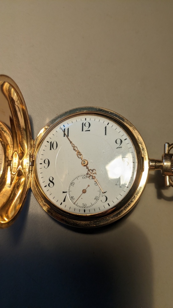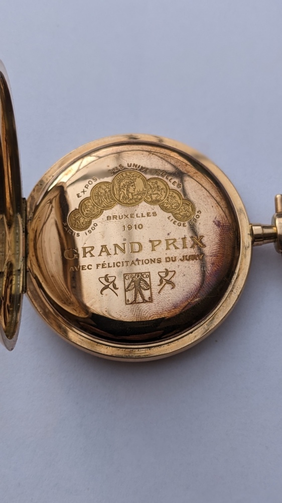 Hallo, wir haben eine Taschenuhr mit 585 Gold-Deckel. Auf der Innenseite ist eine Gravur von der Weltausstellung 1910 in Brüssel. Vielleichth ein Geschenk für die Preisträger? Es gibt keinerlei Zeichen eines Uhrherstellers und das Logo auf der Seite mit der Gravur ist von uns nicht zu identifizieren. Vielleicht kennt jemand hier das Logo.