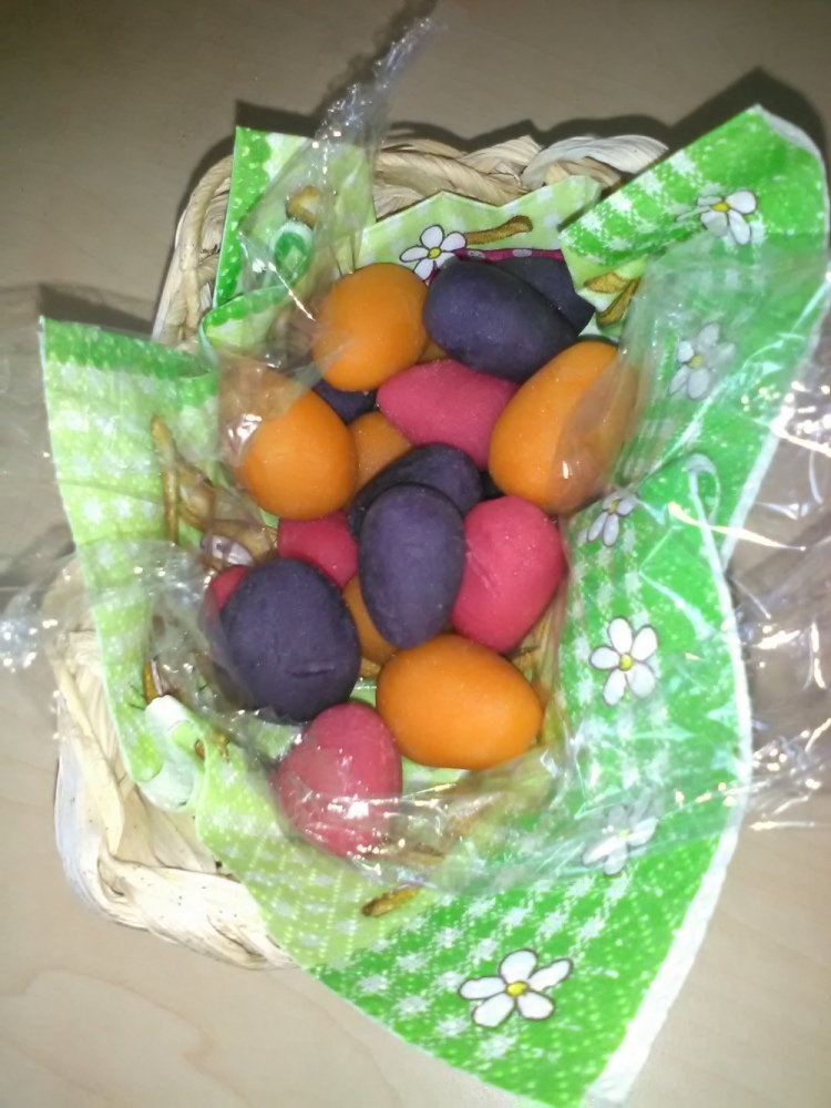 Noch schnell vorm Kaffeetrinken möchte ich euch allen ein schönes und gesegnetes Osterfest wünschen. Mit Osternest und leckeren Petits Fours, die ich gestern gebacken hab. Und das restliche Marzipan sind zu Eiern geworden.