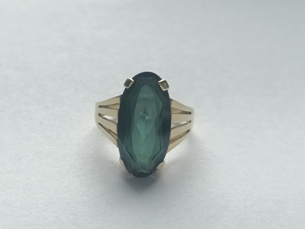 Der Ring ist aus 585er Gold und der Stein vermutlich ein grüner Turmalin. Der Ring wiegt 6 Gramm (Küchenwaage).