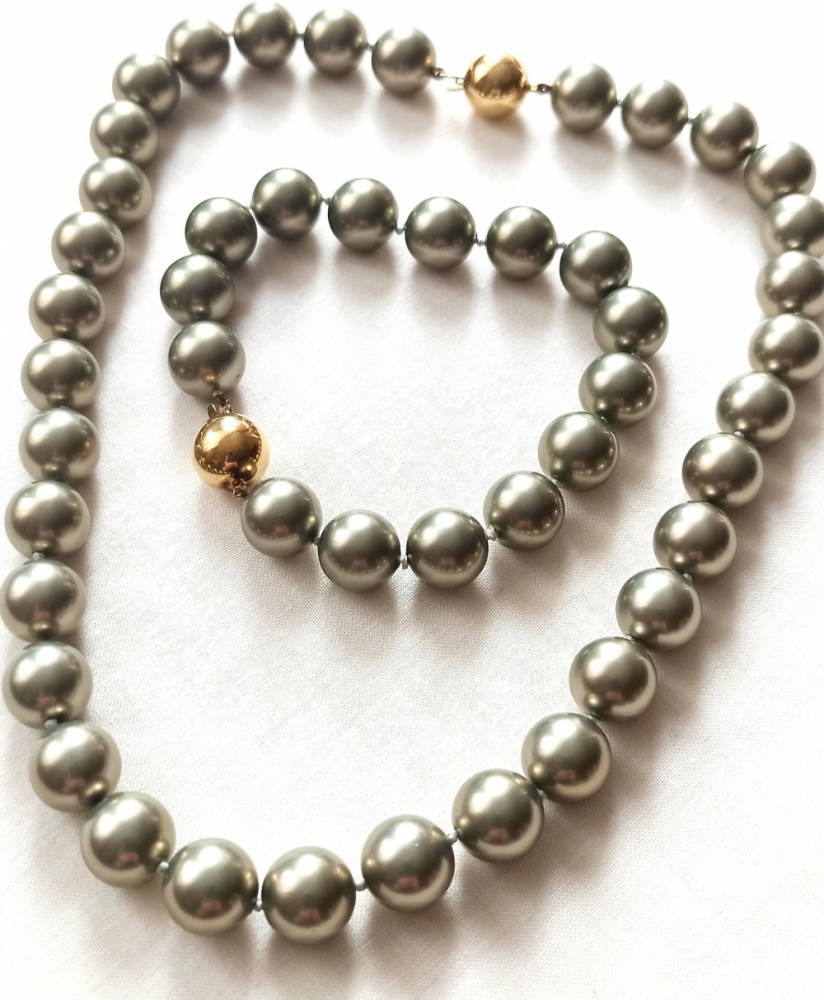 könnt ihr bitte dieses Schmuckset freundlicherweise schätzen? Ich kann mir kein Prüfzertifikat im Labor leisten, aber ich möchte das Set verkaufen. Deshalb frage ich euch nach dem möglichen Verkaufspreis. Es besteht aus einer Halskette und einem Armband, beide mit Tahiti Perlen und Goldkugel-Schließen. Die Schließen sind aus 585er Gold und haben die Maße 1,8 cm x 1,3 cm x 1,3 cm. Die Tahiti Perlen haben einen Durchmesser von 1,3 cm und strahlen in einer edlen, schimmernden grün-grauen Farbe. Die Kette kann auch durch das Armband verlängert getragen werden. Die Länge beträgt 46 cm für die Kette und 22 cm für das Armband.