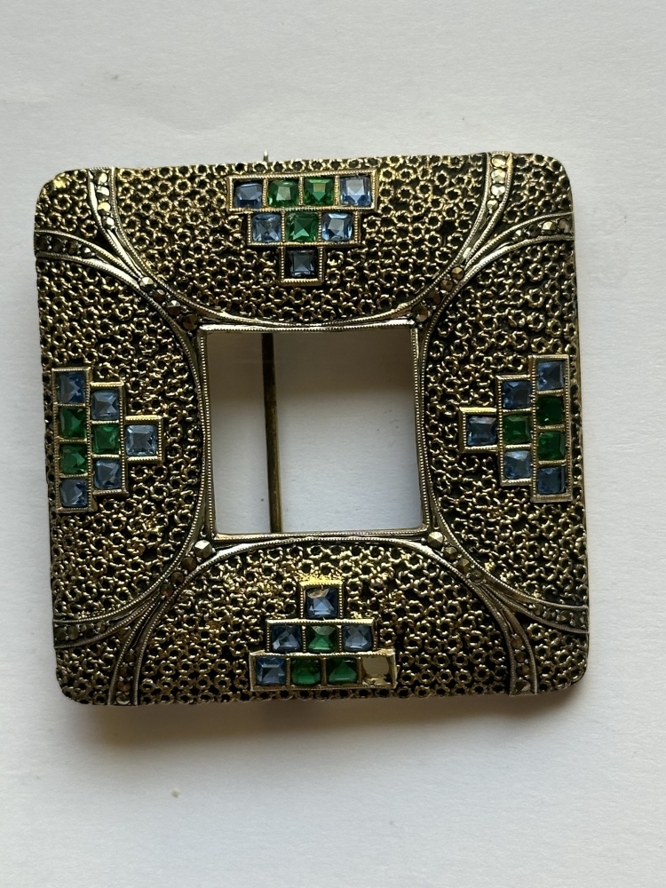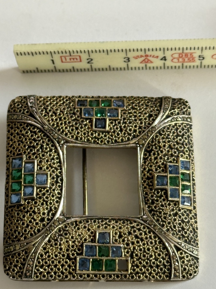 Sie ist laut Punze von Theodor Fahrner, passt vom Stil her denke ich auch, aber leider fehlt einer der kleinen blauen Steine.