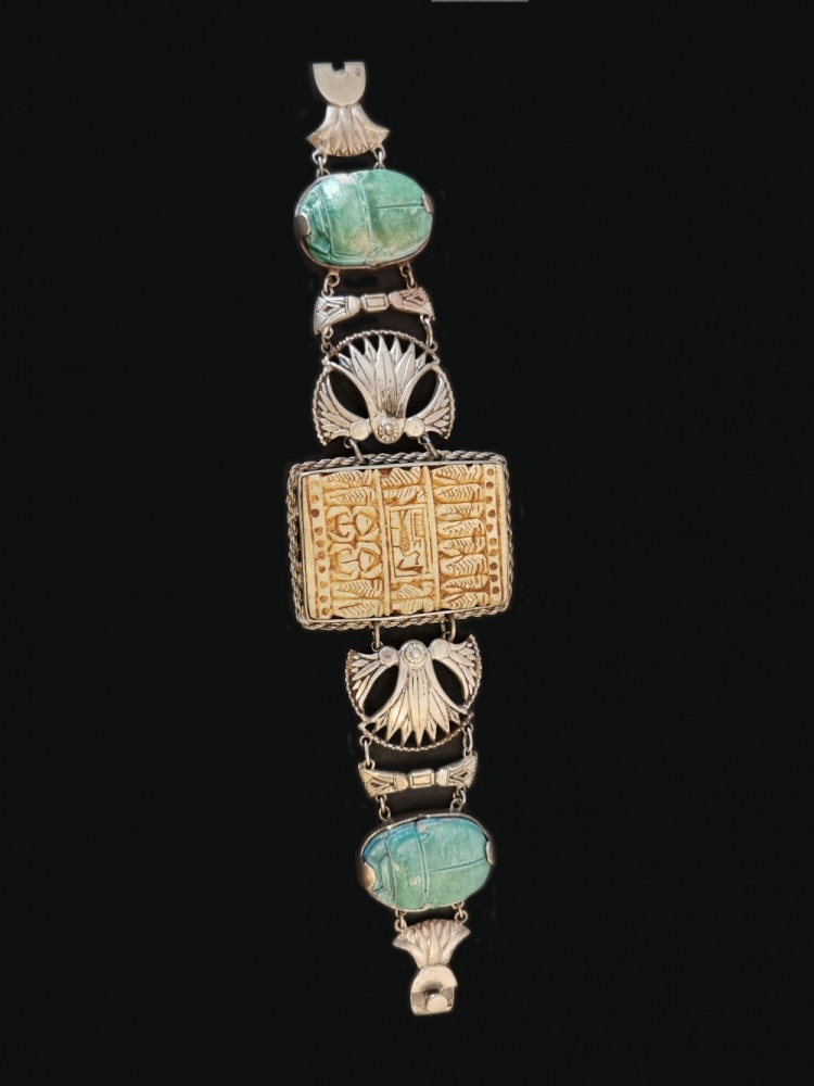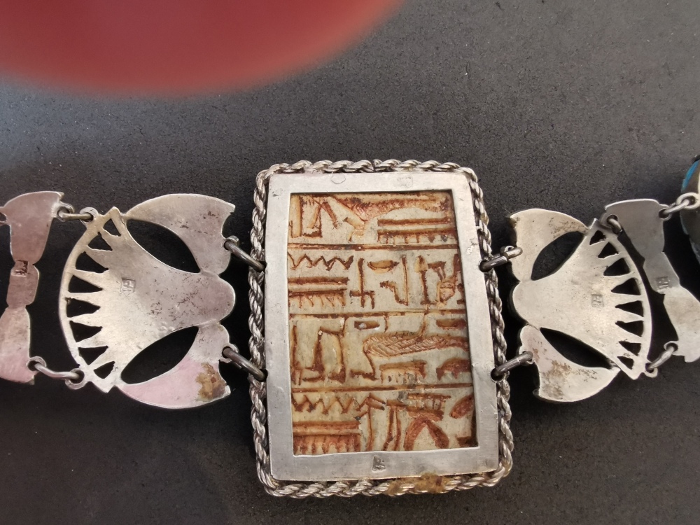 Habe von meinem Vater ein Armband geerbt. Schätzungsweise in den 60er Jahren in Ägypten erstanden. Es ist sehr groß und auf jedem Silberelement punziert. Mit 2 Skarabäen beidseitig einer "Hieroglyphentafel" (45 x 35cm). Gewicht ist 88g. Es hat einen Steckverschluß und ist 20,5cm lang. Es ist sicher Handarbeit, an der Verarbeitung/Lötstellen erkennbar. Mich würde der Silbergehalt/Bedeutung der Punzen interessieren und ggf. ein Schätzwert bzgl. eines Verkaufspreises. Vielen Dank im voraus.