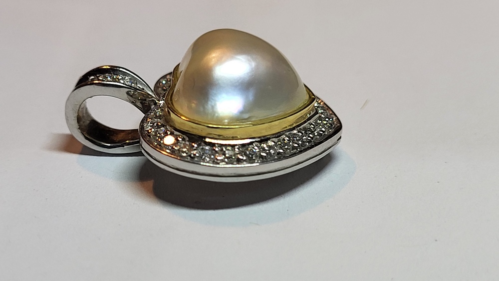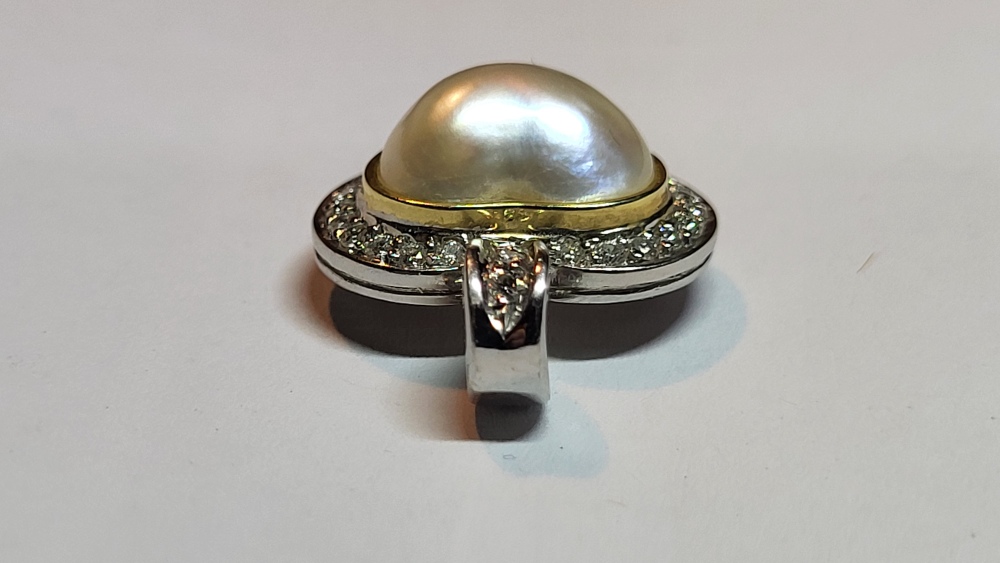 585 Weißgold, mit einer Perle in der Mitte, umrandet von 30 kleinen Diamanten.
