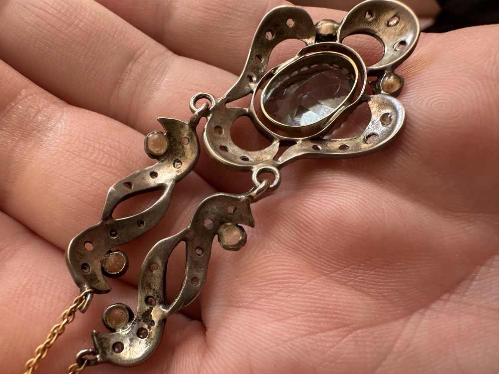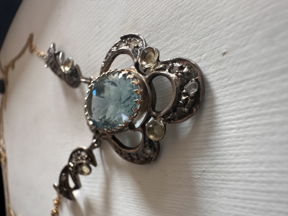 Der Blaue Stein ich vermute Aquamarin ist sehr schön Blau und in Gold ein gefasst.