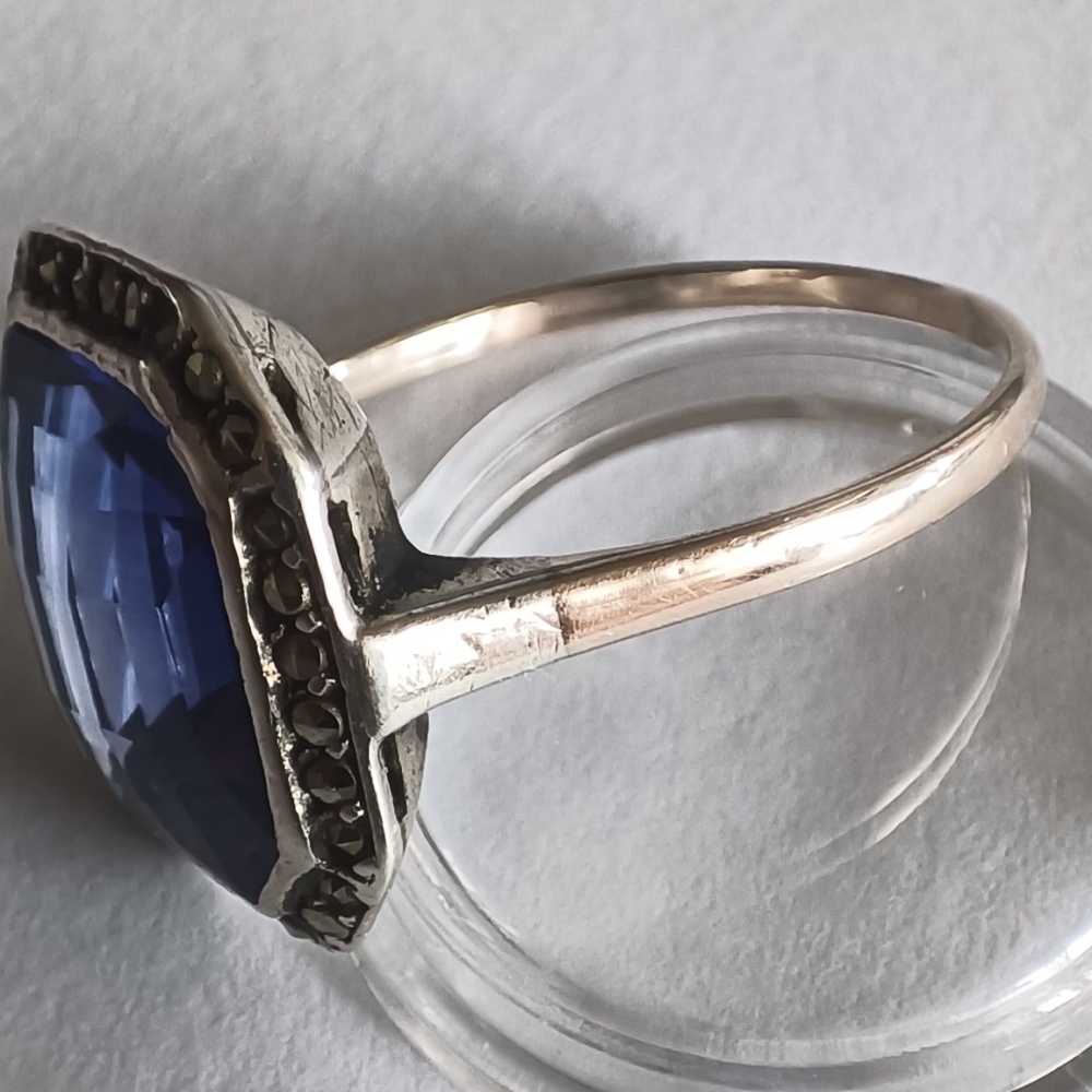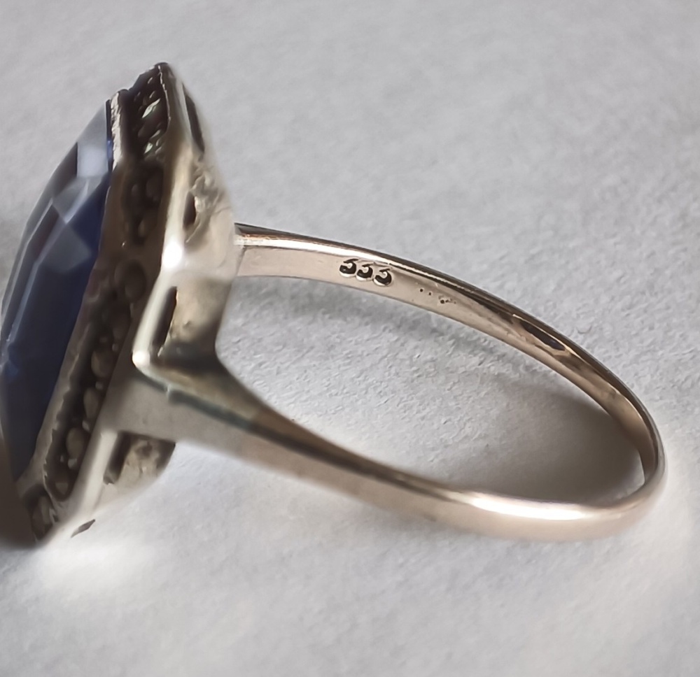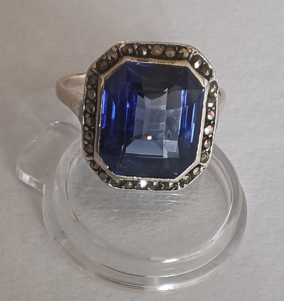Die Ringfassung ist nicht gestempelt und nicht magnetisch und rundherum mit Markasiten(?) verziert . Der Stein ist 12mm x 10mm x ca. 5mm, und scheint auch (hell)blau durch, wenn man ihn gegen Licht hält. Kann ich irgendwie einschätzen, was das ist? Glas, Tanzanit, Saphir? Den Schliff finde ich echt hübsch; oder ist es gepresstes Glas?