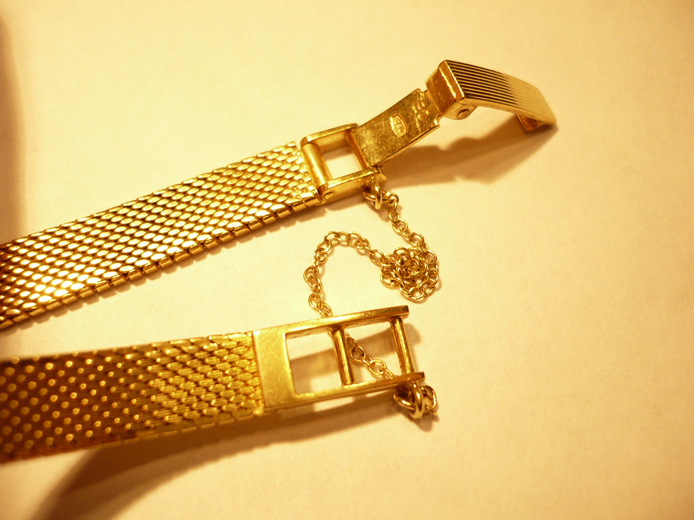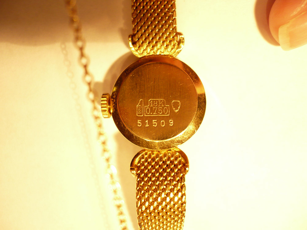 Es ist eine kleine, feine Uhr, gestempelt auf der Rückseite und am Armband jeweils mit 750 bzw 0,750 K sowie die Nummer 51509.Auf dem Zifferblatt steht: Bucherer und swiss made. Die Uhr ist voll funktionstüchtig.