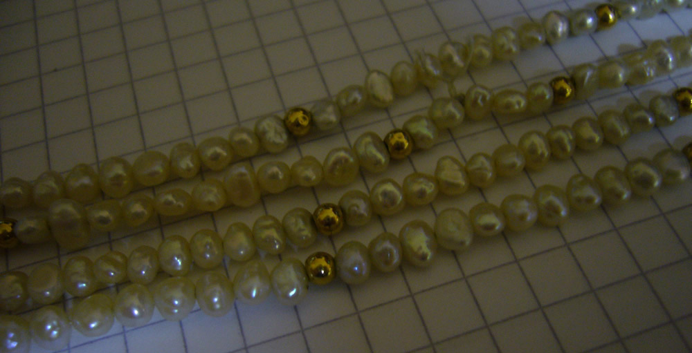 Die Kette besteht aus etwa 250 Perlen und 20 goldenen Kugeln, wobei die Perlen etwa 3-4 mm "groß" sind. Sie scheint bereits gerissen zu sein, da sie an 2 Stellen sichtbar zusammengeknotet wurde.