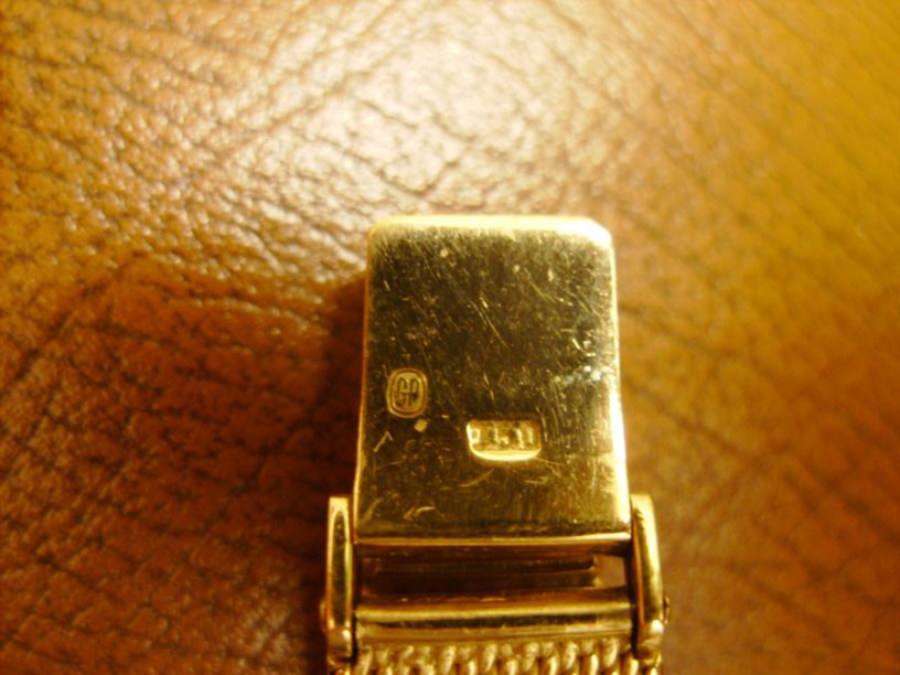 GP-Markenlogos auf Verschluss und Aufzugskrone, zusätzlich GP-Stempel auf dem Verschluss